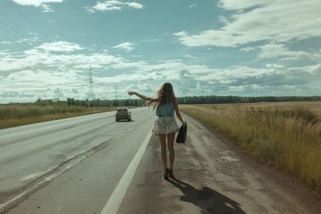 Ένας οτοστόπ. Ήταν αρκετά ασυνήθιστο να βλέπει κανείς κάποιον να στέκεται εδώ- αυτό το κομμάτι του δρόμου ήταν απομακρυσμένο και οδηγούσε μόνο σε μικρά, λιγότερο γνωστά χωριά που οι περισσότεροι άνθρωποι έτειναν να παρακάμπτουν. Η απομονωμένη φύση της περιοχής σήμαινε ότι οι ταξιδιώτες ήταν σπάνιοι, και το να δεις κάποιον στην άκρη του δρόμου ήταν ένα αξιοσημείωτο γεγονός.