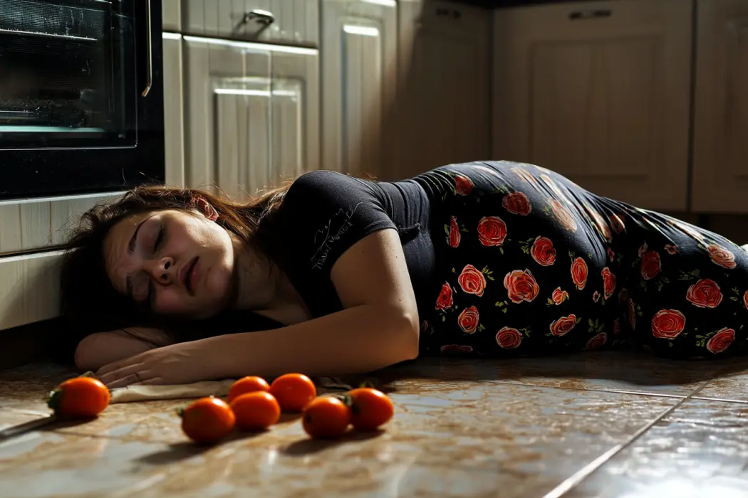 Ήταν πεσμένη στο πάτωμα, το πρόσωπό της φαιδρά χλωμό και η αναπνοή της ρηχή, δημιουργώντας μια απόκοσμη ακινησία που ερχόταν σε έντονη αντίθεση με την προηγούμενη αναστάτωση. Το σκηνικό ήταν ανησυχητικό: η κουζίνα ήταν ένα χάος ακαταστασίας, με κονσέρβες και πακέτα σκορπισμένα, σαν κάποιος να έψαχνε κάτι μανιωδώς.