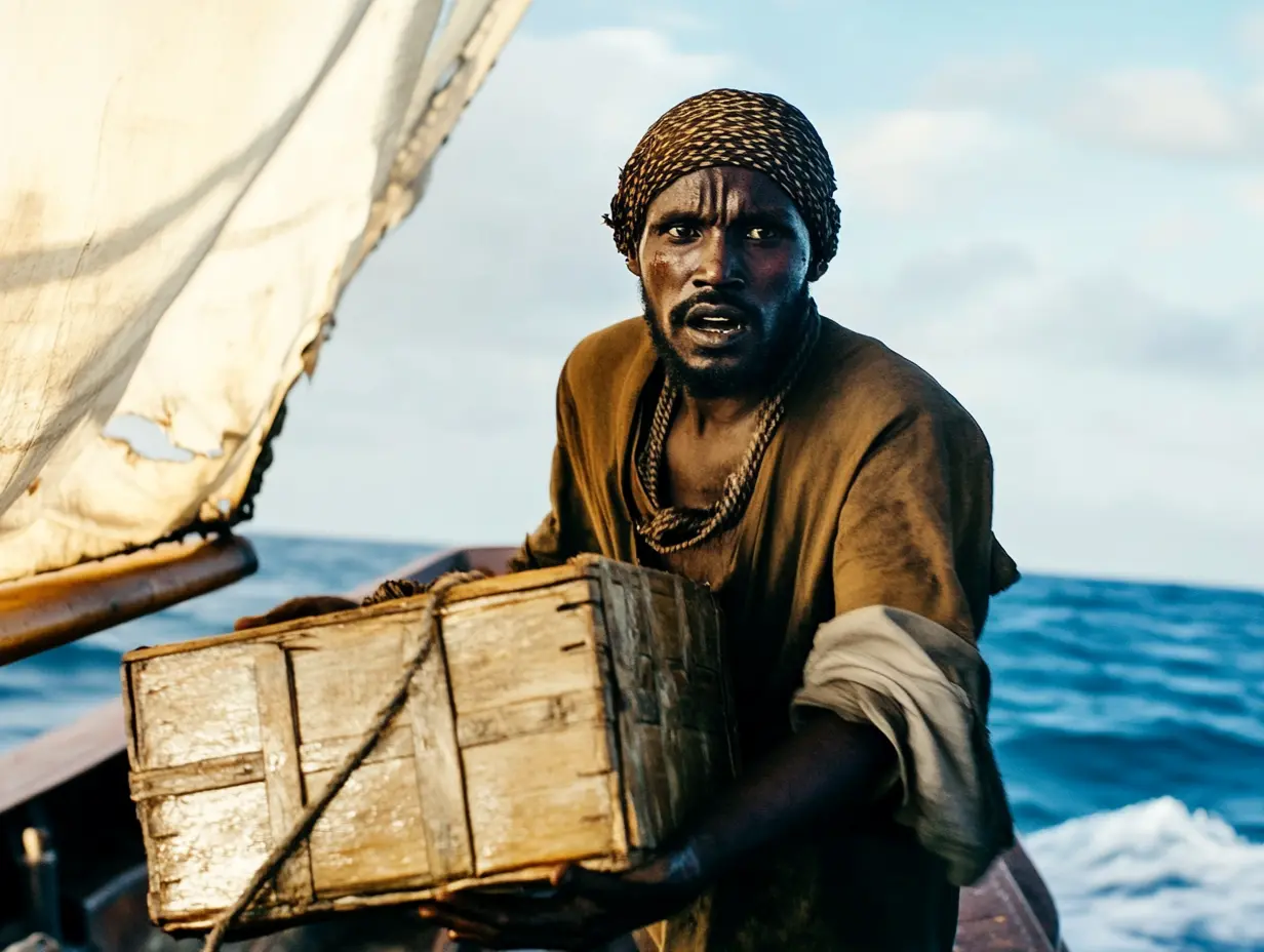 Σχοινιά αιωρούνταν από το πειρατικό σκάφος, κιβώτια που ήδη σύρονταν κατά μήκος του με μανιώδη βιασύνη. Φωνές ξέσπασαν καθώς οι άνδρες προσπαθούσαν να τελειώσουν το πλιάτσικο τους. Τότε ένας νέος ήχος διέσχισε το χάος – μια βαθιά, επιβλητική κόρνα που κυλούσε στη θάλασσα.